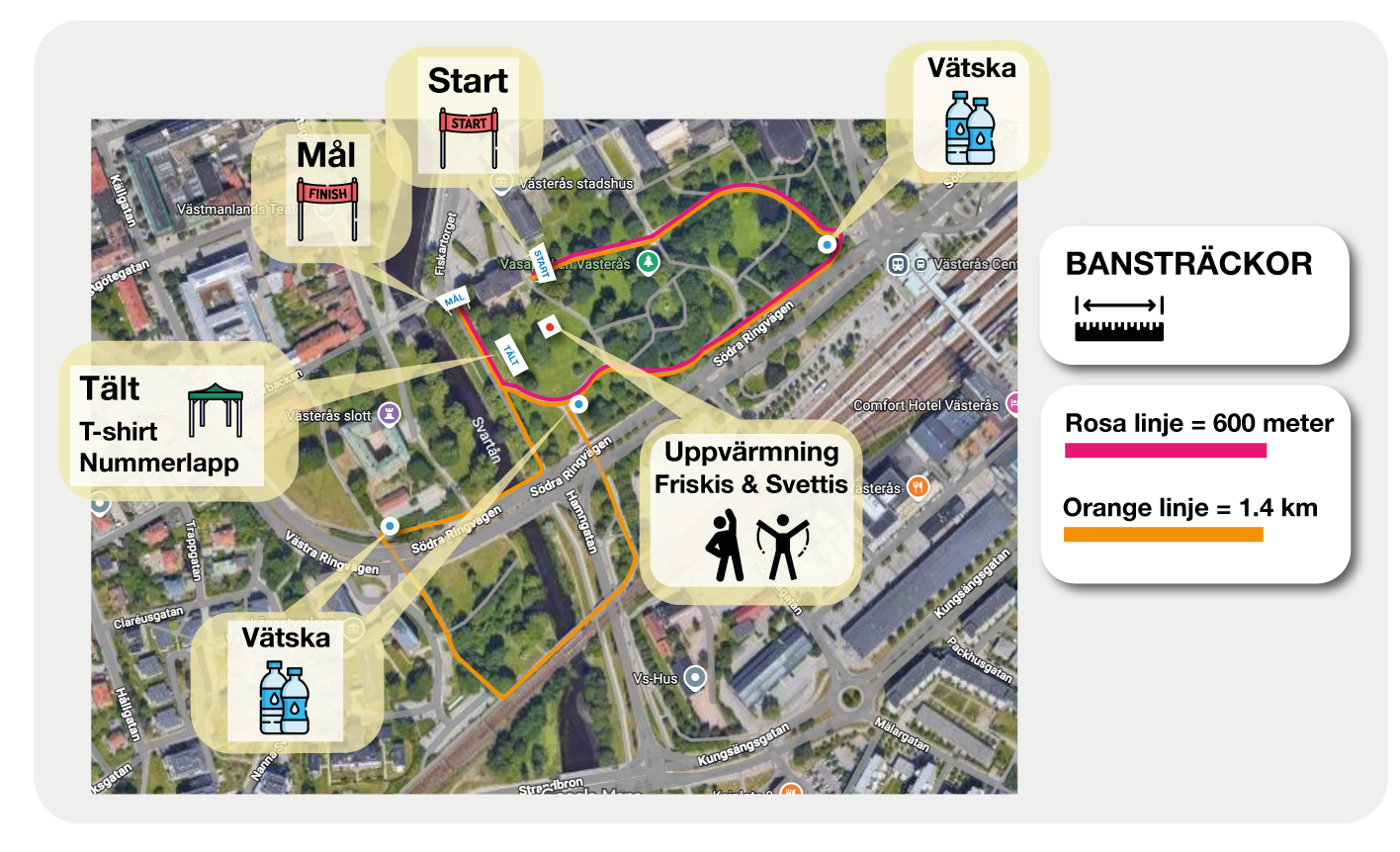 Alla som deltar får en nummerlapp och en T-shirt innan start samt en medalj och en målgångspåse efter målgång.